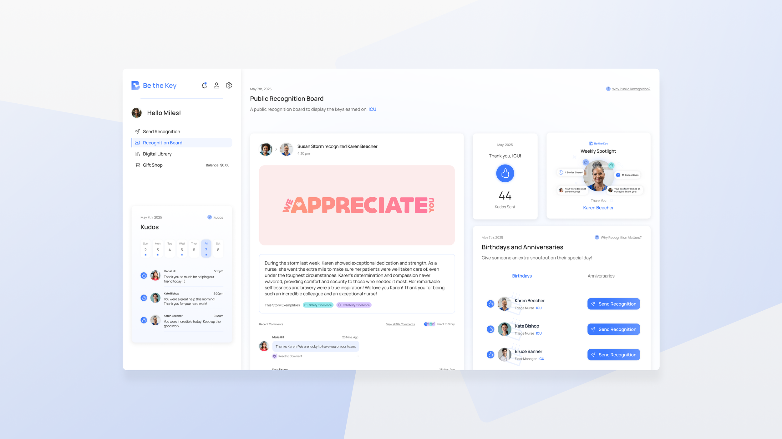 The recognition board serves as the community hub for floor-wide appreciation. Here, teammates can view and comment on recognition “keys,” send quick kudos that contribute to collective rewards, and see upcoming birthdays and work anniversaries—ensuring everyone feels valued and celebrated.