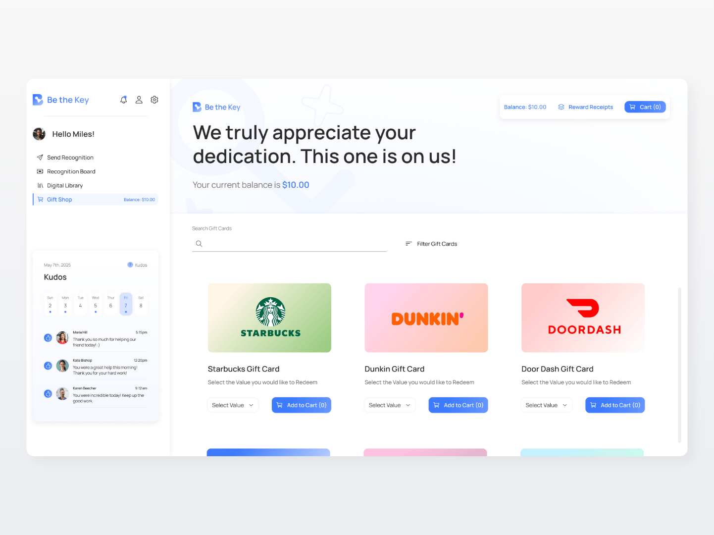 When hard work turns into real rewards. Staff can easily redeem monetary gift cards, with saved information making checkout fast and seamless, sending rewards straight to their personal or work emails.